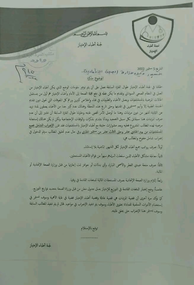 .أعلنت لجنة أطباء الإمتياز عن بداية الإضراب الشامل بجميع المستشفيات إبتداء من اليوم الأحد 11 سبتمبر 2022 حتي 13 سبتمبر 2022 قابل للتمديد حتي تتحقق مطالبها والتي ابرزها صرف رواتب الشهور الماضية ومعالجة مشكلة الاطباء