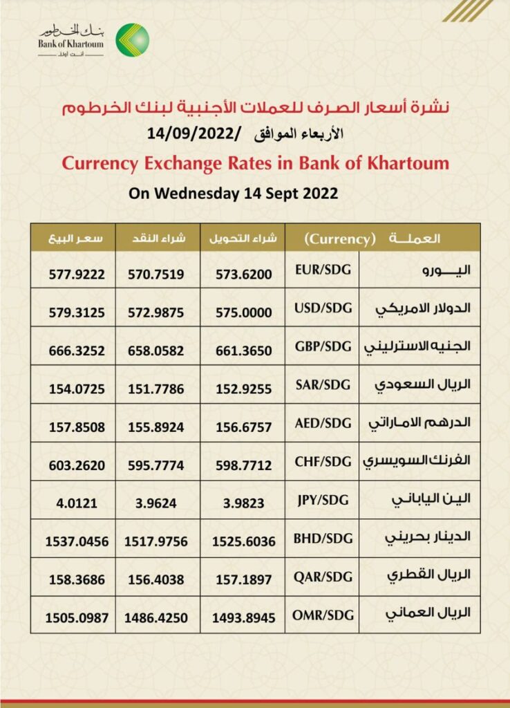 أسعار العملات الأجنبية مقابل الجنيه السوداني اليوم الأربعاء 14 سبتمبر
