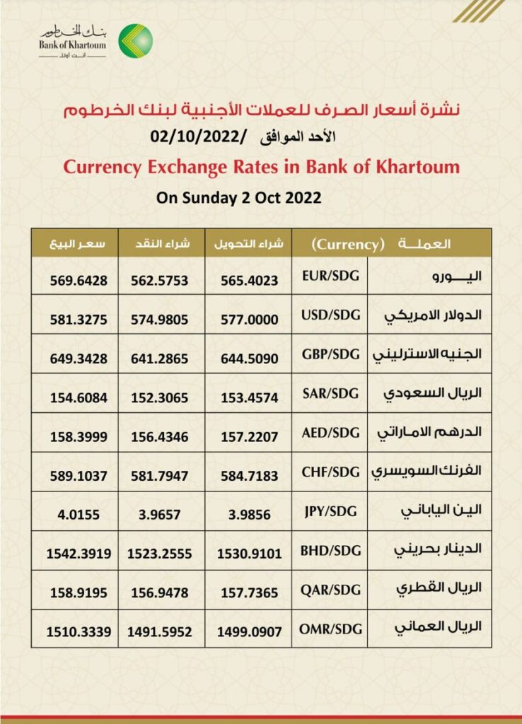 استقرت أسعار العملات الأجنبية مقابل الجنيه السوداني على حالها في افتتاحية هذا الاسبوع لدى بنك الخرطوم كأعلى سعر مقدم من البنوك المحلية حيث استقر سعر الدولار عند 581 للبيع و 574 لشراء النقد و 577 للتحويل بينما تباينت الأسعار بشكل طفيف في بقية البنوك