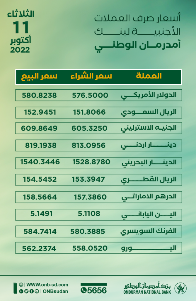 أسعار العملات الأجنبية مقابل الجنيه السوداني اليوم الثلاثاء 11 أكتوبر