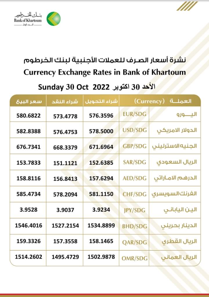 أسعار العملات الأجنبية مقابل الجنيه السوداني اليوم الأحد 30 أكتوبر 2022م