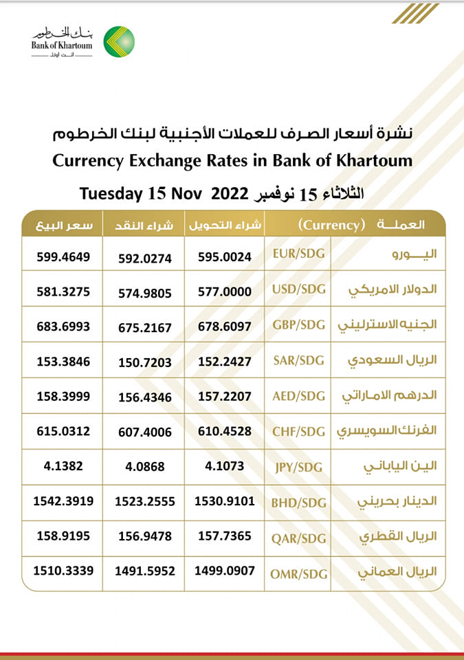أسعار العملات الأجنبية مقابل الجنيه السوداني اليوم الثلالثاء 15 نوفمبر