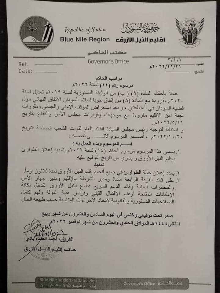 أصدر حاكم إقليم النيل الازرق احمد العمدة بادي مرسوما قضى بتمديد حالة الطوارئ في الإقليم لمدة ثلاثين يوما اخرى.