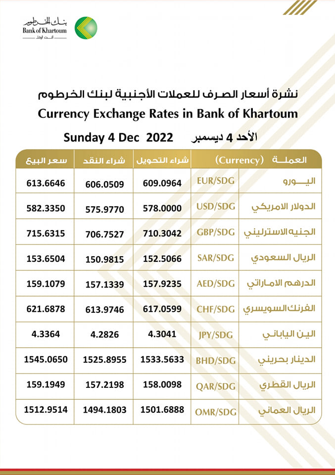 أسعار العملات الأجنبية مقابل الجنيه السوداني اليوم الأحد 4 ديسمبر 2022م