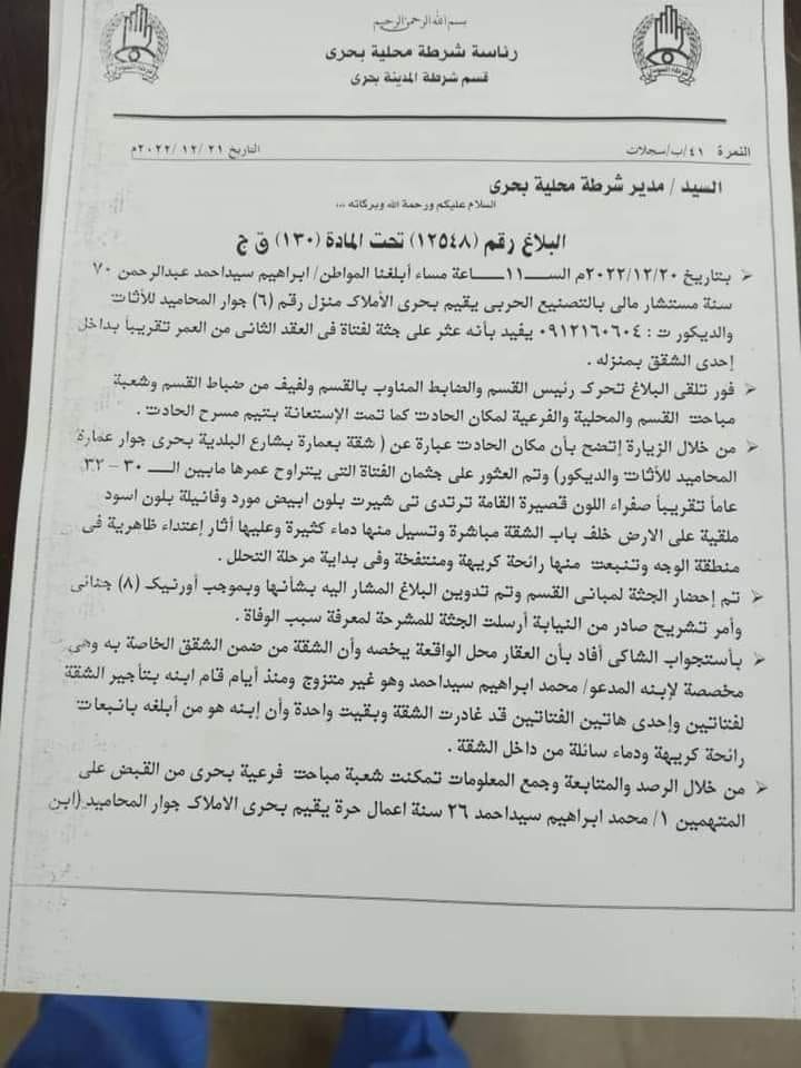 إلى ذلك ألقت قوات الشرطة القبض على قاتل الفتاة وهو مالك الشقة التي كانت تستأجرها الفتاة القتيلة, وفيما يلي يورد “الزول” نص بيان الشرطة حول الجريمة: