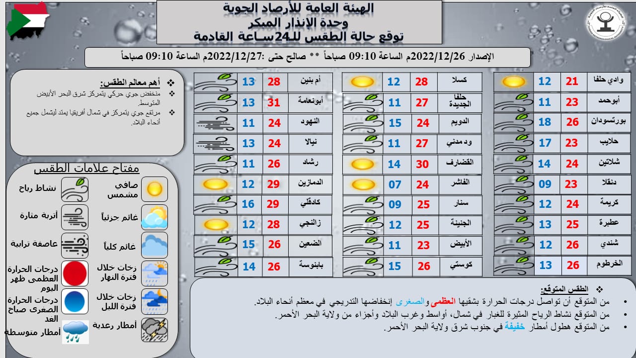 وتنبأت وحدة الإنذار المبكر بالهيئة العامة للإرصاد الجوية في نشرتها اليومية الأثنين بنشاط الرياح المثيرة للغبار في شمال، وأوسط غرب البلاد وأجزاء من ولاية البحر الأحمر.