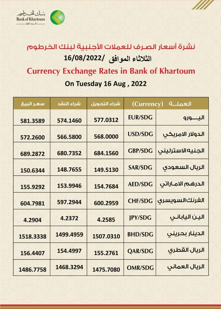 أسعار صرف العملات الأجنبية مقابل الجنيه السوداني اليوم الثلاثاء 16 أغسطس 2022م
