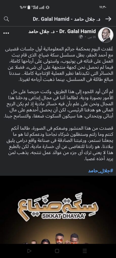 كتب الدكتور جلال حامد منتج مسلسل سمة ضياع على صفحته الرسمية بالفيسبوك تفاصيل قضيته أمام الممثل أحمد الحقر حيث قال: