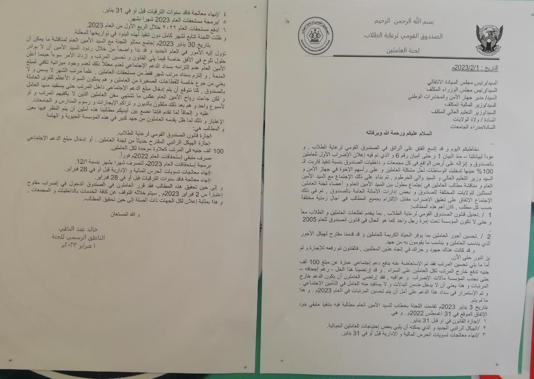 قرر العاملين بالصندوق القومي لرعاية الطلاب الدخول في إضراب مفتوح اعتبارا من اليوم 2 فبراير بعد أن وصل العاملين الى طريق مسدود مع الإدارة، سيتم خلاله التوقف عن كافة الخدمات بالداخليات والمجمعات إلى حين تحقيق المطالب والتي حددها العاملين في إجازة قانون الصندوق القومي لرعاية الطلاب، وإجازة الهيكل الراتبي المقترح من لجنة المعلمين وإدخال مبلغ الدعم الاجتماعي 100 الف جنيه في المرتب كعلاوة موحدة لكل العاملين، صرف متبقي استحقاقات عام 2022م فورا، وإنهاء معالجات تسويات الحرس المالية والإدارية قبل أو في 28 فبراير، إنهاء معالجة فاقد سنوات الترقيات قبل أو في 28 فبراير.