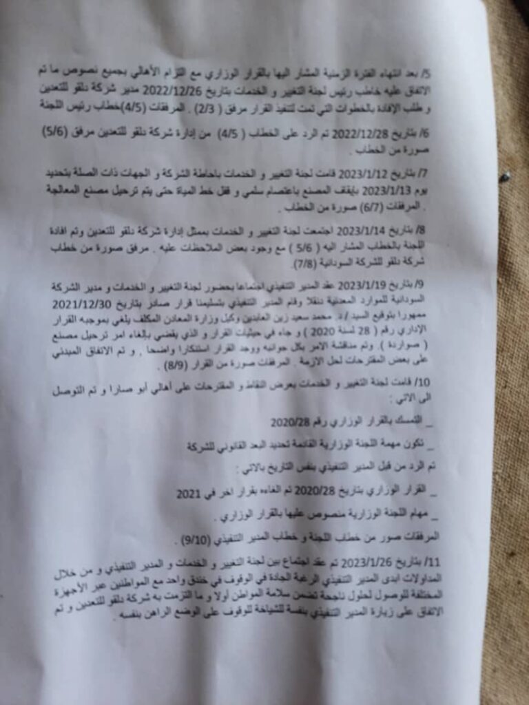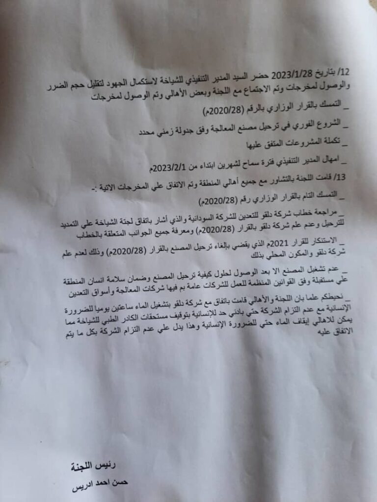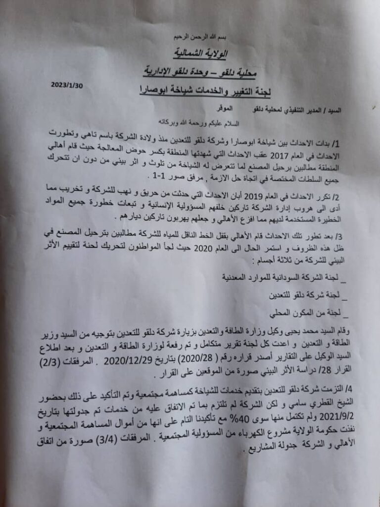 ويأتي الاعتصام حفاظا على البعد الآمن، وأشار المواطنون في خطاب موجه للمدير التنفيذي لمحلية دقلو إلى أن الشركة تسببت في تلوث بيئي خطير في المنطقة.