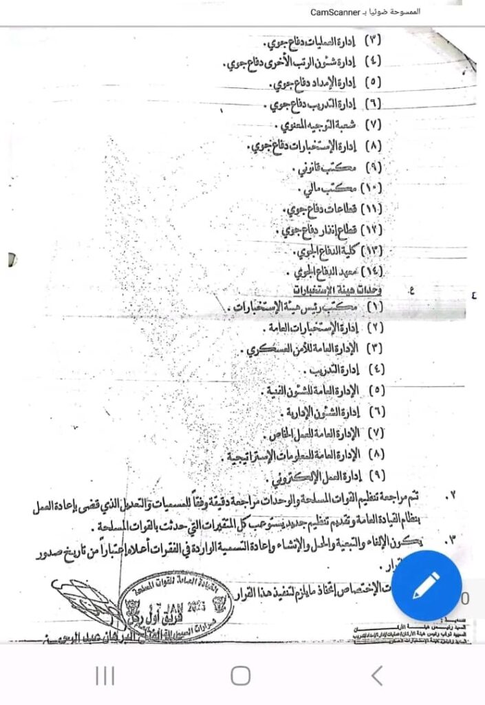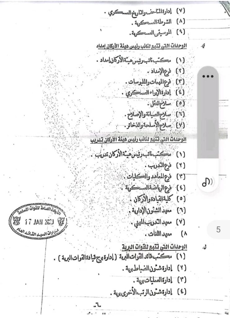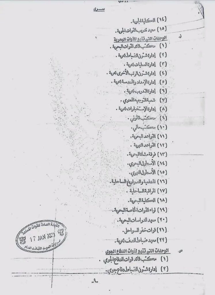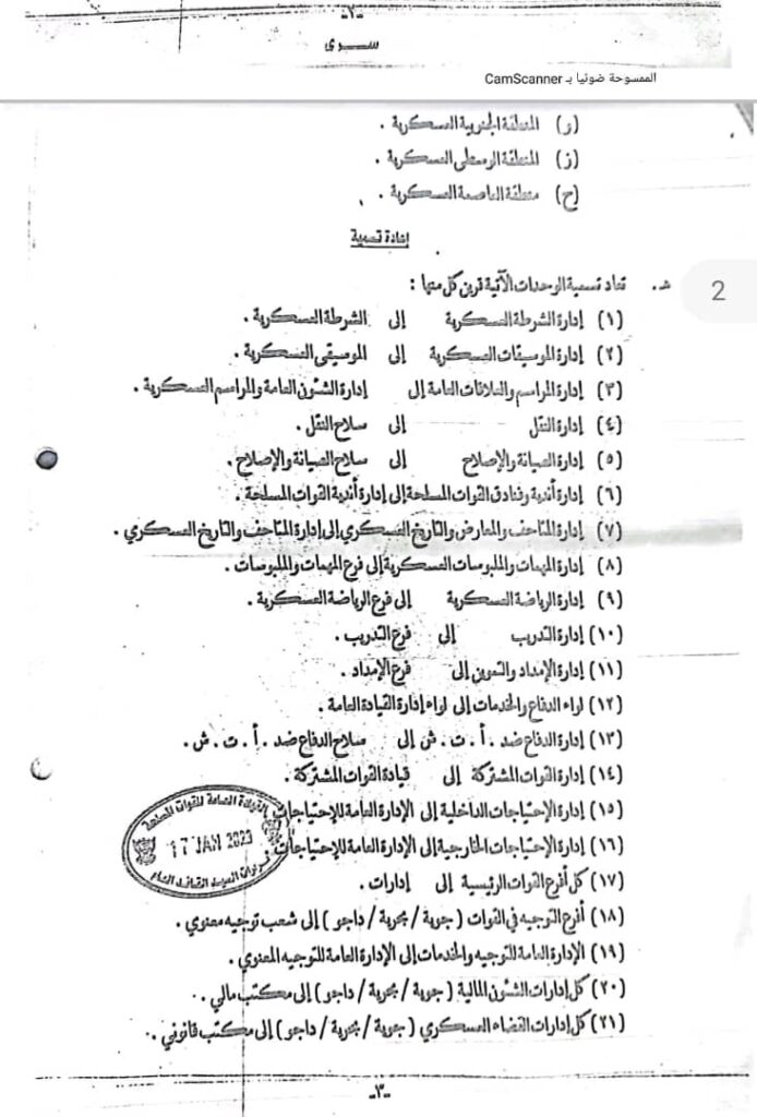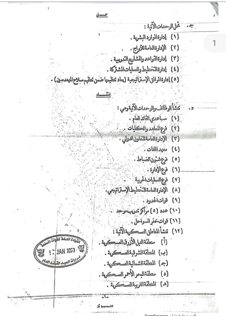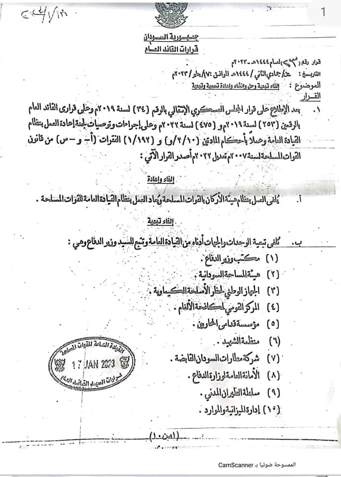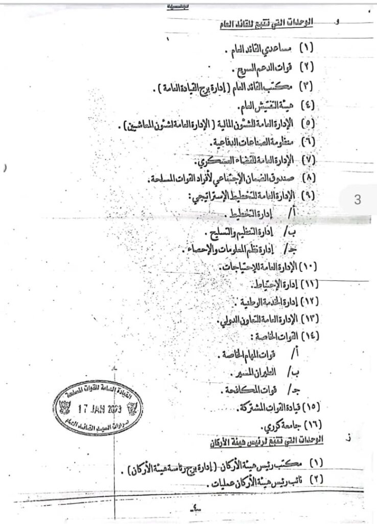 كما شملت القرارات تبعية قوات الدعم السريع للقائد العام وحل هيئة الأركان المشتركة وتعيين مساعدان للقائد العام