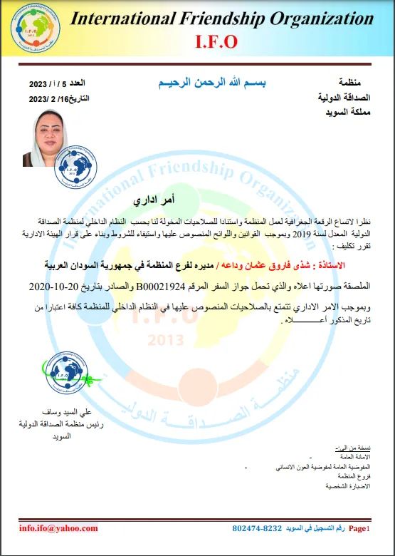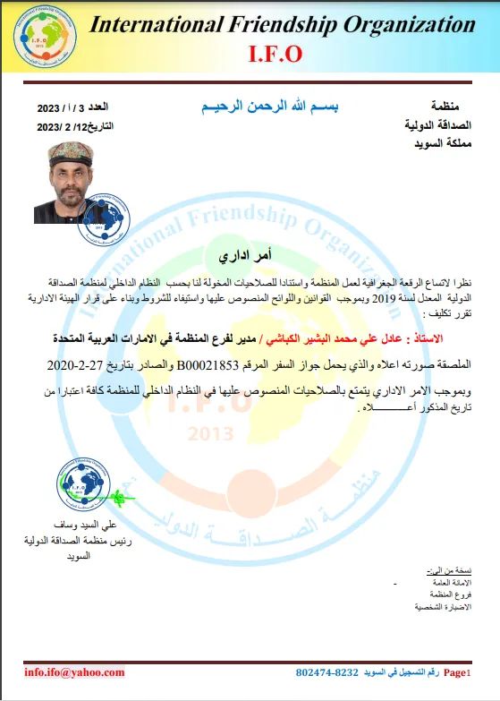 أصدرت منظمة الصداقة الدولية بالسويد قرارا اداريا بالرقم ١٣/٢٠٢٣بتاريخ ١٢/٢/٢٠٢٣ بتكليف الاستاذ عادل محمد البشير مديرا للمنظمة بالإمارات العربية المتحدة وتحويلها له بالصلاحيات المكفولة وتعزيز الثقة له في الادارة بحرية مطلقة، ونشرت المنظمة على صفحتها الرسمية بالفيسبوك: