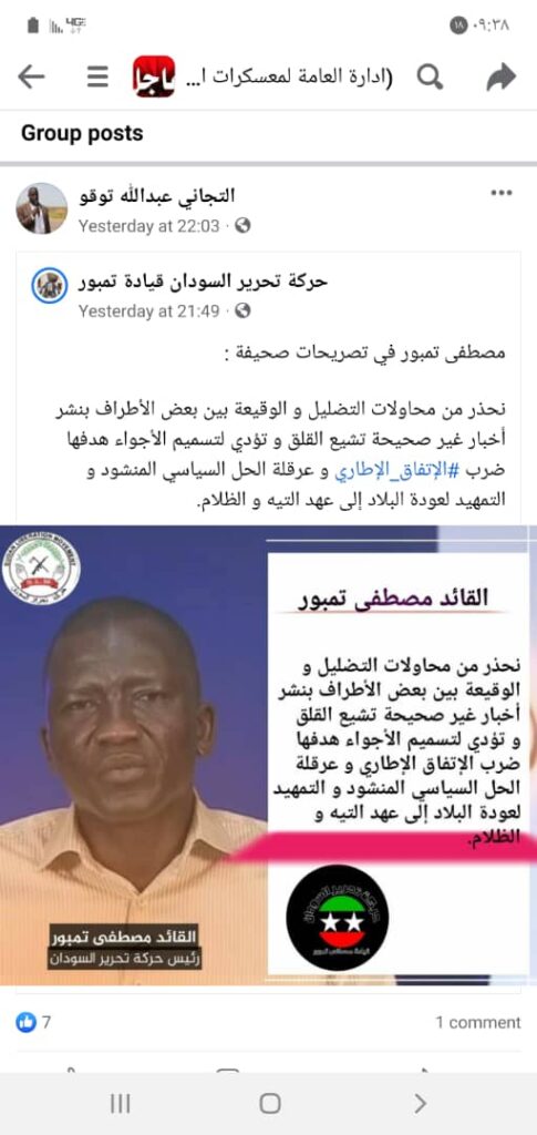 وصفت حركة تحرير السودان بقيادة القائد مصطفى تمبور الصفحات المنشورة على وسائل التواصل الاجتماعي ومدون عليها تصريحات لقائد الحركة بأنها مزورة.واعلن الناطق الرسمي باسم الحركة التيجاني عبد الله توقو اعتزام الحركة اتخاذ الإجراءات القانونية في مواجهة مروجي تلك الصفحات. وقال توقو ان إعلام الحركة يمتلك صفحات رسمية ويتواصل مع جميع الوسائط الإعلامية بشفافية.