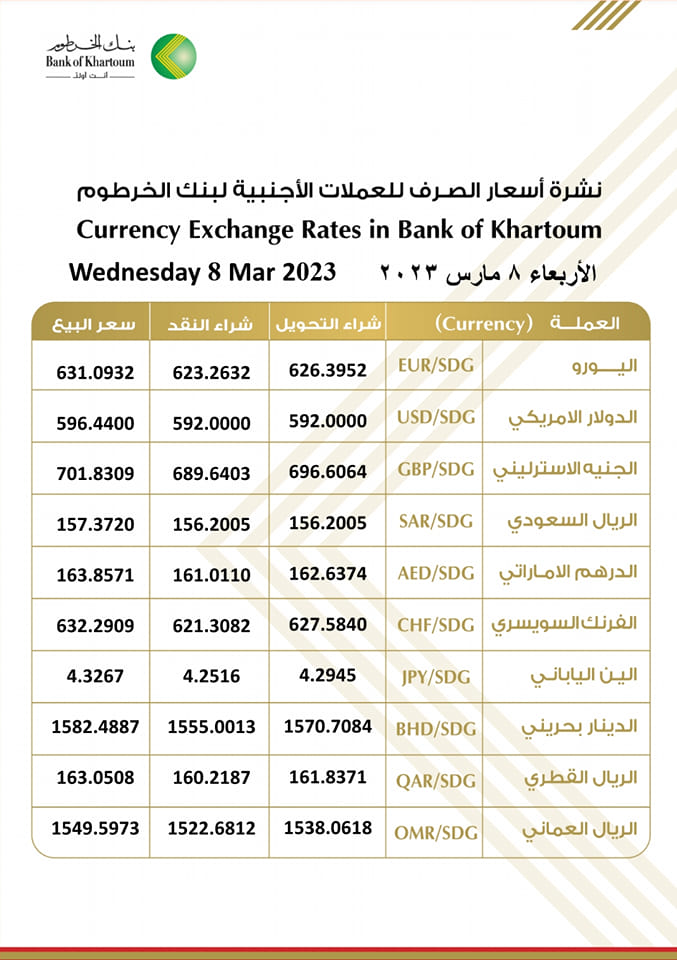 أسعار العملات الأجنبية مقابل الجنيه السوداني اليوم الأربعاء 8 مارس 2023م