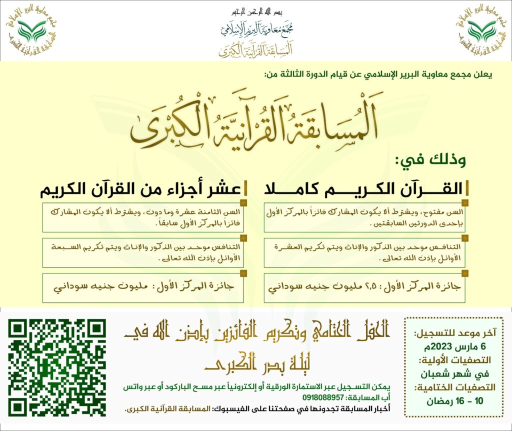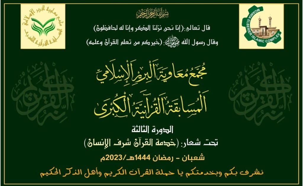 تنعقد في هذه الأيام المباركة من شهر رمضان الكريم التصفيات الختامية للمسابقة القرآنية الكبرى التي يقيمها مجمع معاوية البرير الإسلامي بدورتها الثالثة، والتنافس فيها ضمن مساقين: الأول كامل القرآن الكريم وهو مفتوح لكل متسابق ومتسابقة، والثاني: عشر أجزاء من القرآن الكريم.وتأتي هذه الدورة بتميز ملحوظ من نواحٍ متعددة، فقد تضاعف عدد المسجلين عن الدورة الثانية بمقدار مرتين ونصف إذ بلغ ألفاً وأربعمائة متسابق ومتسابقة، وكذلك تم اعتماد نظام اختبار أولي وختامي، فبعد التصفيات الأولية في شعبان تقرر ترشيح عدد أربعين متسابقاً في فرع كامل القرآن الكريم وعدد خمس وعشرين متسابقاً في فرع عشر أجزاء من القرآن الكريم.كذلك تم اعتماد نظام تحكيمي يتتبع الدرجات وأنصاف الدرجات وأرباع الدرجات عبر نموذج تحكيمي أعدته إدارة المتسابقة بالتعاون مع جمعية المقرئ هشام أحمد جنيد والذي سيرأس لجنة التحكيم النهائية لكامل القرآن الكريم، وهو من المجازين بالقراءات العشر الصغرى والكبرى ويرافقه شيخان من القراء الجامعين للقراءات العشر هما الشيخ عبد الملك بكري دملخي والشيخ عبد الله محمد عبد الله، ويكون مقرراً للجنة المقرئ الشيخ: عمر عبد الرحيم.وتبدأ التصفيات الختامية بمشيئة الله تعالى يوم السبت العاشر من رمضان ضمن ليالٍ وأمسيات قرآنية في حديقة المجمع بامتداد ناصر، متاحة للحضور العام تبركاً بالذكر الحكيم وشحذاً للهمم في صدور المستمعين كباراً وصغاراً.وبرعاية كريمة من الحاج معاوية محمد احمد البرير وحرمه السيدة إيمان يحي المهدي تقررت زيادة الجائزة هذا العامالتكلفة الكاملة ست وثلاثون مليون جنيه سوداني لتكون بمقدار مليونين ونصف جنيه سوداني للفائز الأول في فرع كامل القرآن الكريم، ومليون جنيه للفائز الأول في فرع العشرة أجزاء.كذلك تم اعتماد تكريم عشرة متسابقين في الفرع الأول، وسبعة في الفرع الثاني.وشهدت المسابقة تنافساً طيباً أشرف على تصفياته الأولية جمع من الشيوخ المقرئين المجازين بالسند المتصل إلى النبي صلى الله عليه وسلم، وكان تنافس المتسابقين بإحدى الروايات الثلاث المقروء بها في السودان: حفص عن عاصم والدوري عن أبي عمرو وورش عن نافع.وسيكون الحفل الختامي بإذن الله تعالى في ليلة عظيمة مهابة، هي ليلة بدر الكبرى رجاء بركتها وإحياء لذكراها وربطاً للأمة بماضيها وأمجادها وسيرة نبيها الكريم الذي أنزل عليه القرآن صلى الله عليه وسلم تسليماً كثيراً.