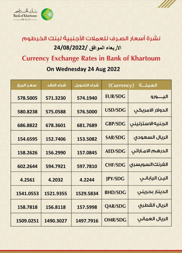 ارتفاع أسعار العملات الاجنبية مقابل الجنيه السوداني اليوم الاربعاء 24 أغسطس 2022م