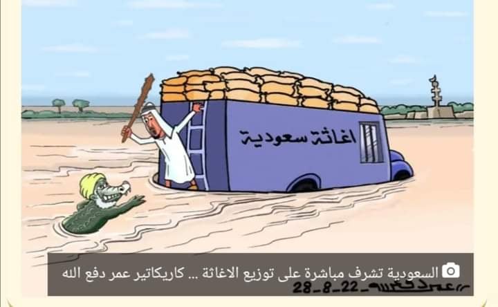 قام الوفد السعودي بالإشراف علي توزيع الإغاثة السعودية بأنفسهم، مؤكد بأن هذه الخطوة ماهي الإ مؤشر مهنم لعدم الثِقة الكافية في إيصال المناديب للإغاثة للمُستحقين من الطائرة مباشر للأماكن المتضررة بالسيول والأمطار بسبب عدم توفر الشفافية، لا مخازن لا جملونات ولا غيره، كاريكاتير أبرز العُقال يحمل عكازاً لِمناوشة التمساح البشري داخل المياه الذي كان ان يبتلع المعونة،