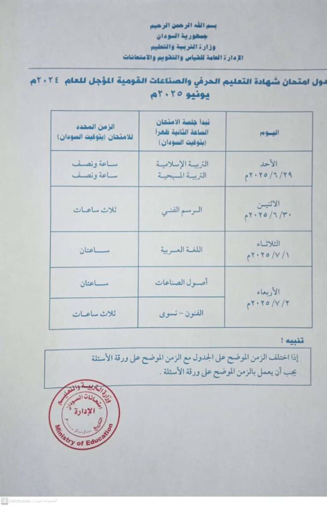أعلنت وزارة التربية والتعليم السودانية عن جدول امتحانات الشهادة الثانوية للعام 2024، الخاصة بالدفعة المؤجلة، والتي من المقرر أن تبدأ يوم الأحد 29 يونيو 2025 وتنتهي يوم الخميس 10 يوليو 2025.