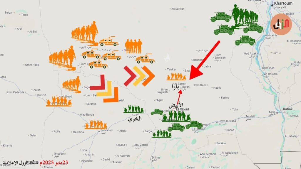 من خلال متابعة مجرى العمليات يتضح ان مدينة الأبيض تحتاج لعملية تامين من الناحية الشمالية وكذلك متحرك الصياد المتجه لمحور النهود ولكي يتم ذلك يحتاج الجيش لربط جنوب امدرمان بالابيض اي يعني استلام كامل طريق الصادرات مرورا بجبرة الشيخ وبارا لتبدا قوات من الجيش التحرك غربا من بارا نحو ام بادر ليزول الخطر من ان قد تستعمل المليشيا الناحية الشمالية وبارا والناحية الشمالية الغربية لمباغته الجيش من تلك المناطق خصوصا تحرك وتواجد المليشيا في ذلك الحزام من مليط بشمال كردفان الى جبرة الشيخ ومازالت المليشيا تدفع بمزيد من القوات الى مناطق شمال النهود عبر ذلك المحور . مع تقدم الجيش في محور الدبيبات قد تسعى المليشيا لاحداث عملية عسكرية في محاولة لرفع الروح المعنوية لجنودهم ومحاولة احداث اختراق في احدى جبهات القتال لكن الخطة العسكرية الميدانية التي ظهر بيها الجيش بعد بدء العمليات العسكرية للمتحركات في كردفان تظهر دقة التخطيط والترتيب لخوض المعارك في كردفان والتقدم لدخول دارفور .