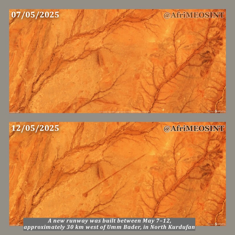 كشفت منصة AfriMEOSINT المعنية بالتحليل والرصد الاستخباراتي، عن رصد إنشاء مدرج ترابي جديد في صحراء شمال كردفان خلال الأسبوعين الماضيين من شهر مايو 2025، داخل مناطق تخضع لسيطرة لمليشيا قوات الدعم السريع، ويقع على بعد نحو 30 كيلومترًا غرب مدينة أم بادر.