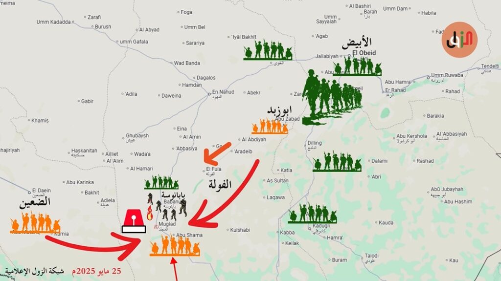 ودفعت المليشيا بتعزيزات لقواتها في محاور غرب كردفان لمواجهة متحرك الصياديتوقع أن تشهد هذه المحاور عمليات عسكرية مع الضغوط المتزايدة على المليشيا لتعدد محاور القتال.