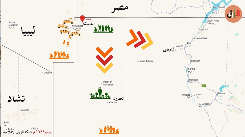 وسابقا ذكرنا في محور الجنينة أن هناك قوات يتم تجميعها قد تتحرك في محور الصحراء عبر كتم،وفي يوم ٢٤ ذكرنا ان هنالك قوات للمليشيا موجودة في الجنوب الليبي تستعد للتدخل وتشكل خطرا على قوات المشتركة في المثلث وفي العطرون .