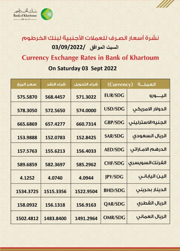أسعار العملات الأجنبية مقابل الجنيه السوداني اليوم السبت 3 سبتمبر 2022م